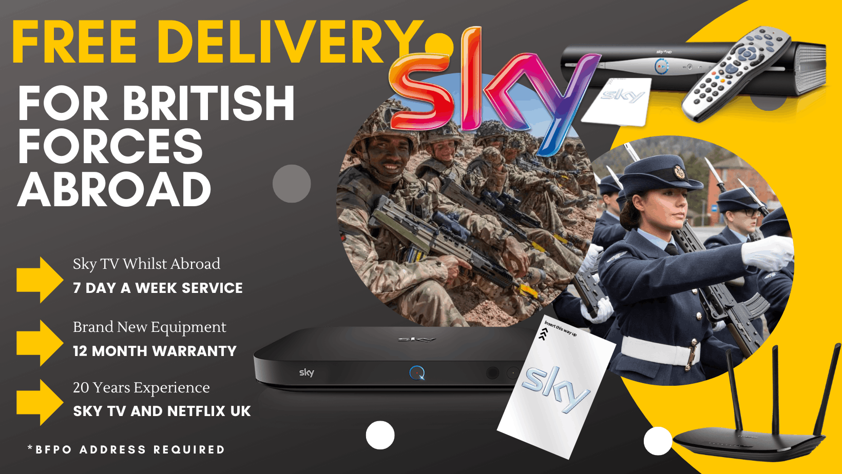 As long as you have a BFPO address we can ship the equipment to you for free. Sky + HD boxes, Sky viewing cards , Sky Stream and SKy Q are all available with free delivery.