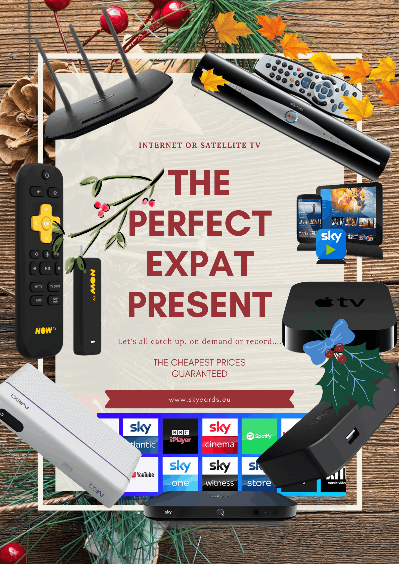 A Roku TV box and a VPN router at £59.99 would give you LIVE Sky TV as well as LIVE BBC and ITV streamed through the internet to your TV on a pay as you go basis without a contract. The box doesn’t require a satellite signal as it is an internet TV box working through WiFi. It also has a massive collection of catch-up and On Demand features.